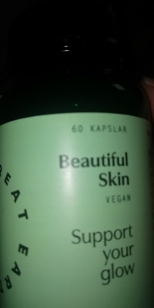 Now we come to how I take care of my skin from the inside. I take many supplement but for my skin I take this supplement. Great earth “Beautyful skin”. If you or someone you know suffer from acne breakouts you should try it. I don’t know if it’s because of this supplement or that my skin just feel good right now but since I began taking it I have had less acne breakouts. My skin looks even and have a healthy color. You take two capsules a day and they are easy to swallow because they are not big.