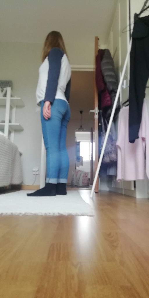 I’ve been thinking about something. I can’t almost get my jeans on. It’s a struggle every time. I try to pull them up but to get them over my belly is almost mission impossible. I pull and jump too and it takes forever to get them to fit. When I’m out doing things I just wait for them to burst. I can hardly sit down because I don’t know If they can take the weight of me sitting down. Not to mention when it’s time to stand up. I’m happy every time they don’t just break. Another thing I think about is when I go to the toilet somewhere else other than when I’m home. What If I can’t get them on again? What If they won’t fit my belly? If that happened what would I do. Run home? If I’m in the mall do I have to have a walk of shame to a clothing store and buy a new pair of jeans? Maybe I should buy bigger jeans so I don’t have to think about it. I never had these problems when I was younger.